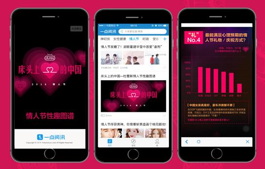 互动创意奖金奖——杜蕾斯“床头上的中国”。利用一点资讯用户大数据优势和新闻媒体属性,通过对多维度、立体化用户数据内容价值进行深度挖掘,发布“床头上的中国”情人节用户大数据报告,用理性的数据新闻唤起公众对于两性健康的关注。同时,整合双方媒体资源,对数据报告进行全方位传播与解读,充分增大杜蕾斯品牌曝光度与美誉度。