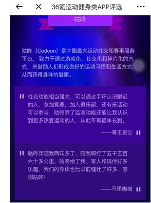 36氪是国内知名的互联网创业生态服务平台,36氪媒体成立五年来已服务超过11,000家创业企业;其中90%属于中国创业项目的初次曝光,体现出极大的传播价值。全新改版的36氪APP希望打造移动互联网时代的综合性资讯平台,帮助用户更精准地把握商业趋势、内容价值,体现科技资讯的营养。此次“生活方式项目评选活动”将会在各个垂直领域发起项目评选,是对目前国内创业企业和优秀产品的一次集中曝光。 咕咚是中国第一个在线运动品牌,目前已有用户7000万。在移动互联网的大背景下,咕咚创始人、CEO申波创立了“运动社交”概念,以平台为依托,打通体育产业链上下游,围绕运动人群解决“运动前、运动中、运动后”的痛点,满足从个人到群体的运动社交生活需求。 2016年,咕咚完成5000万美元C轮融资,从运动大数据、内容生态、线上/线下赛事运营、增值服务四个方面,打造闭环的“全民运动生态系统”。面对巨大的运动人口,咕咚一直努力把“UGC(用户生产内容)+PGC(专业生产内容)+运动场景”相结合,带来高价值、深度定制、体验丰富的原生内容,提升信息触达、分享的精准度,实现多元化运动内容消费。这是专属“互联网+体育”的运动生活模式。.