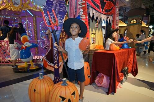 近几年的万圣节,不仅是年轻人喜欢玩,也是孩子们翘首期盼的节日,时尚天河为了让小朋友们能亲身感受到西方“不给糖就捣蛋”的传统,在中区童话街入口请来魔法女巫坐镇,家长们凭任意消费小票即可跟女巫兑换一份节日装备给小朋友,连续三天可领取一整套装备,包括魔法帽、魔鬼三叉、南瓜罐,让小朋友们化身魔法小精灵在童话街区讨糖玩乐,大人们也可以凭消费50元以上的有效消费小票可获得南瓜气球一只。