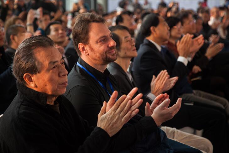 著名艺术家尚扬(左一)出席开幕式。(摄影:李毓琪) 6个主题展、8个专题展、2个特展、3个校园展,加上韩国10家特邀画廊、国内9家参展画廊,共计38个展示区,展示了近500位艺术家的1200余件作品,这些作品和代表性艺术家从国际及国内各地来到中山,参与此次中山历史上最大的艺术博览会。据主办方评估,此次展出作品的总价值超出10亿元人民币。