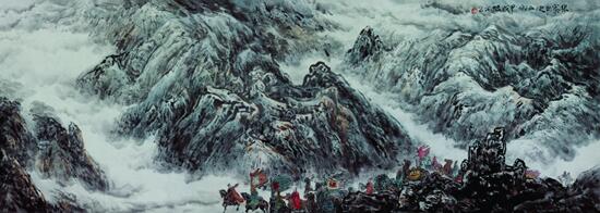 司马迁 “创作没有冲动激情,无情无意出不了好作品”,这是旭东教授的终生感悟。《生当作人杰》《辛弃疾词意》《孔子周游列国》《陈毅雪夜行军图》《芦荡火种》等出自旭东教授笔下,记载和承载历史的“圣图”,格局气度高雅壮观至极。他把英贤们忧国忧民、慷概激昂、不畏艰辛、共赴国难的生动气韵展示无遗。画面雄关漫道、山高路险、激流阻隔、荆棘遍地、阴霾蔽日、满目瘡痍、国破山河在的恶劣背境,烘托出英贤们掷地有声,悲壮昂扬的高大形神,沉与痛警醒我们不能忘却曾经的苦难。每幅作品皆墨情动人、再加上神到笔随的点睛边款,把先祖英贤民族至上、国家大义表现得淋漓尽致,彰显出永不褪色的价值。