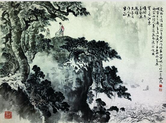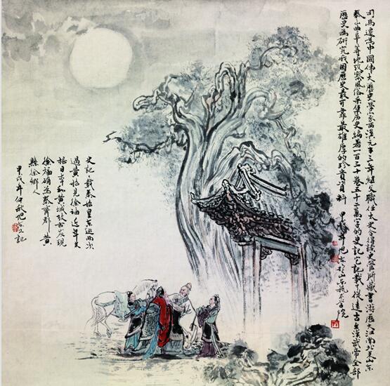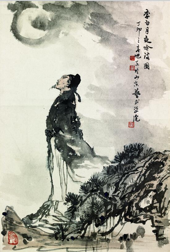 李白月夜吟诗图 尽管历史上山川阻隔、舟车不便,但齐鲁悠久的历史、中华文明的摇篮、厚重的文脉灵气,阻不断、拦不住古时人们的心仪和追逐想往,吸引了大批名人高士相约互邀结伴前往观瞻、求学、凭吊、雅集,从而留下许许多多脍炙人口的千古佳话名句。《王维行吟香积寺》《李白杜甫相聚曲阜》《司马迁访孔府》《蒲松龄夜游大明湖》《苏东坡词意》等绘画作品醇厚高古、率真质朴。旭东教授敢于独创一派,他在每幅作品中充分展示其山水画技特长、人物造型深厚功底,巧妙调动艺术智慧、犀利视角,准确提炼人物情感、场景布局,将每则故事、一段深情,演绎得情景交融、珠连壁合、气氛和谐、意蕴殊深、如临其境、如见其人。