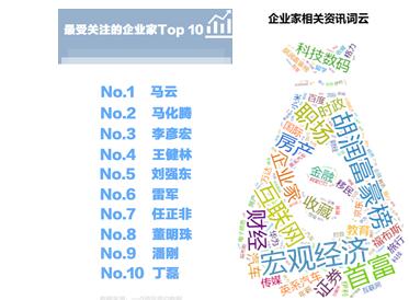 BAT称霸企业家榜单 企业家排行榜依旧是BAT的天下,马云、马化腾、李彦宏位列Top前三名,胡润富豪榜、宏观经济、互联网等词语作为企业家“养成”修炼手册的必读内容,在与企业家相关的关键词搜索上占据前列。