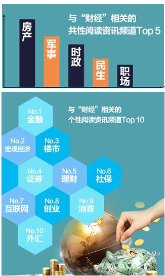 “共性”与“个性”频道关联密切 个性阅读深度延展用户垂直兴趣 值得一提的是,除了满足用户一般需求的“共性”阅读频道描绘出了用户的关注焦点走向,深度延展后的“个性”资讯频道,也不同程度反映了用户需求。 其中, 房产、军事和时政是阅读“财经”资讯最关注的共性阅读内容; 而延展至垂直的个性领域,楼市、证券、理财类的资讯关注度高。