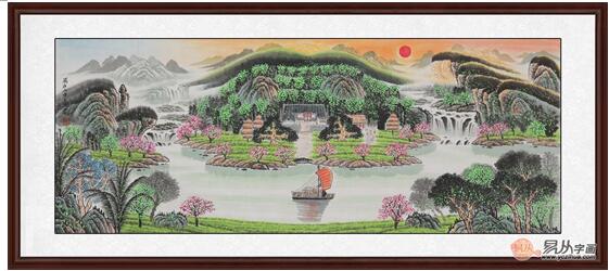左青龙右白虎 李林宏聚宝盆风水画《紫气东来》作品来源:易从网 “背山面水,山怀水抱”山顾盼有情,水曲折有致,典型的风水格局。将浩荡的天地之间氤氲之气跃入画卷,灵气,福气财气相随融通,丰泽绵绵,这样的一幅山水画挂于客厅让您的事业蒸蒸日上。是非常不错的挂客厅风水山水画。 这幅秀美的山水画,给我们带来的是一种娴雅温暖的山水之乐,在初升的太阳润色之下,万物都被披上了如梦幻般的金黄暖色,我们即使是在冬天也能够感受到来自山水画意境中的那份温暖舒适,作品如世外桃源般的向我们展示了远古人们的生活方式,流水瀑布,小船人家,一些都是如此的安静祥和,这样的山水画挂在家中彰显品位,优雅从容。 易从网年度风水画推荐四: