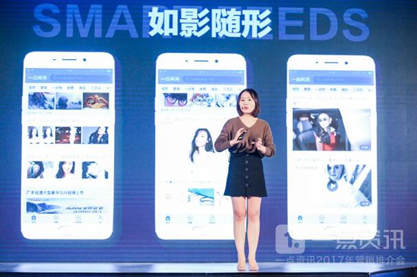 一点资讯副总裁付继仁在现场演讲 关于2017年的规划,付继仁提到:“一点资讯2017年要做五件事,一是通过技术获取更大规模更高质量的流量,二是获取更高质量内容,并让这些内容去链接用户的生活,三是让大数据加持移动互联网营销服务,四是打造更多差异化的营销产品,五是成为移动互联网最大的兴趣孵化平台。” 【亮点三:做千人千面的广告服务产品】 推介会现场,一点资讯营销策略顾问王梦介绍了Smart feeds(智能化信息流)等全新的商业化产品,她提到:“智能化信息流是对News feeds的升级,它的智能体现在标签的智能化、分发的智能化和样式的智能化。” 随后,王梦介绍了一点资讯基于Smart feeds之上开发的五大广告产品:更简洁智能的试驾等信息收集产品“一步到位”、将品牌信息规模化植入文章内容与用户阅读场景的“场景融合”、实现品牌内容与超级IP智能绑定的“如影随形”、在用户搜索页植入品牌信息的“一搜即达”、实现用户与品牌内容精准激活的“一触即发”。