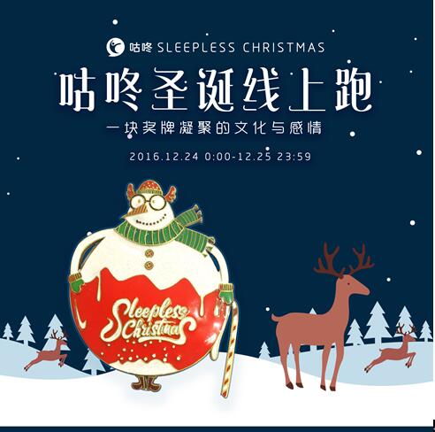 从孩提时代起,我们听说过、深信过、憧憬过,12月24日晚上,早早上床睡觉的乖孩子,第二天会在床头的袜子里发现满满的惊喜,这要感谢一位雪白胡子的红衣老人,在半夜驾着鹿雪橇,偷偷从窗口钻进来,满足所有人的心愿…… 咕咚决定,要做一回运动社交界的圣诞老人——2016年圣诞,咕咚线上马拉松将迎来年终盛大的自有IP赛事“圣诞线上欢乐跑”。在24日和25日,报名参加圣诞跑的咚粉们,将有机会得到限量版圣诞雪人奖牌套装。20,000套,唯虔诚跑者得之。