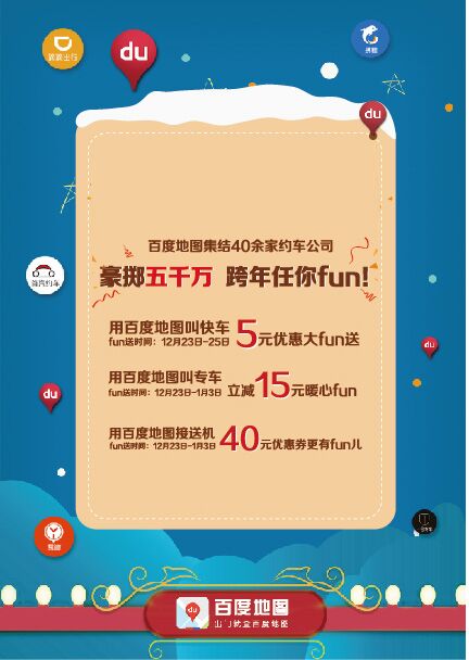 福利一:用车方式任意选 品类丰富便利出行 截至目前,百度地图已经接入到首汽、易道等约40家汽车服务商,并综合各家提供的价格、优惠、预计到达时间等关键信息,为用户提供全网比价,从而选择出品质最好、性价比最高的专车出行服务。除此之外,还可选择快车、出租车、接机车等多种出行工具,保证所有叫车需求都能得到满足。 活动期间,用户可通过活动专区进入到活动页面,直接点击领取优惠券按钮即可,优惠券领取完成后,下单后便能使用。使用方式也很简单,只需点击路线,在路线中输入起点和终点,选择具体的出行方式(如专车),便可形成导航叫车一站式的解决方案。 福利二:三大优惠助力节日狂欢 接送机服务可享40元 除了能提供多种出行方式,百度地图还在活动期间推出三大优惠,助力节日狂欢。12月23日-25日期间,使用百度地图呼叫快车即可获得5元优惠券,12月23日-1月3日期间,使用专车可立减15元,而使用接送机则直接发券40元。无论哪种选择,都能享受到优惠。