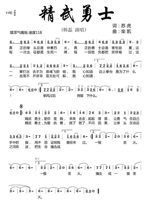 《精武勇士》 【作词】苏虎 【作曲】栾凯 【演唱】韩磊 真正的拳头,总是伴着烈火, 真正的勇士,总是害怕寂寞, 这一拳打出去,不为谁魂飞胆破,