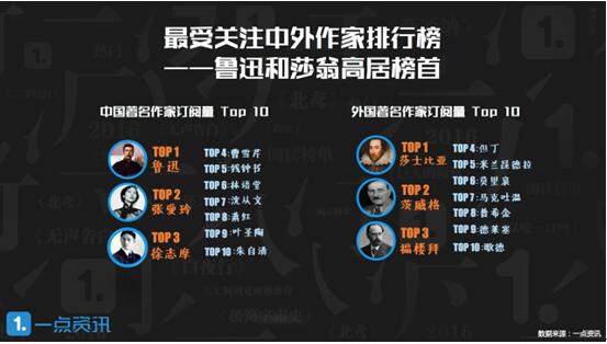 鲁迅和莎翁成最受欢迎中西方作家,张爱玲依旧风华绝代 数据显示,鲁迅和莎士比亚两位文学巨匠分别位列中国和外国著名作家订阅量榜首。此外,张爱玲凭借其广为流传的《金锁记》、《倾城之恋》、《半生缘》、《红玫瑰与白玫瑰》等一系列优秀作品,排名中国著名作家第二位。而浪漫诗人徐志摩、茨威格、福楼拜等中外著名作家均榜上有名。