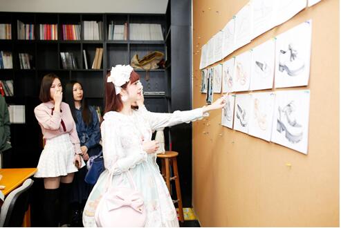 青木美沙子仔细观看墙上Lolita系列鞋款设计手稿